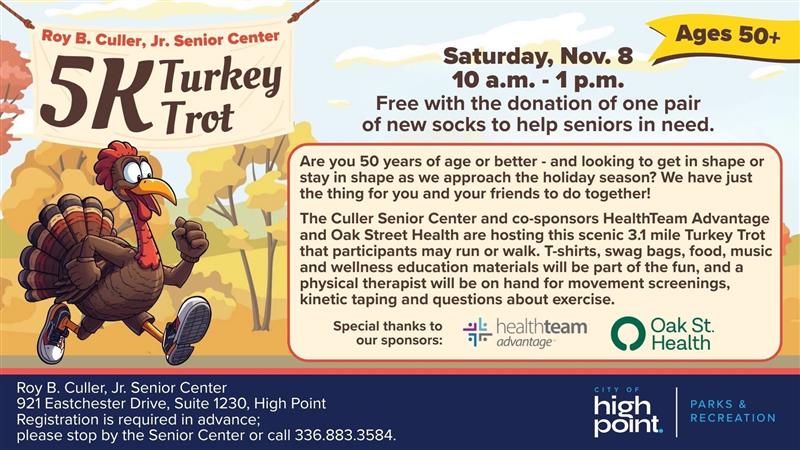 Are you 50 or older and want to stay active this holiday season? Join the HealthTeam Advantage, Roy B. Culler Senior Center, and Oak Street Health for a scenic 3.1-mile Turkey Trot! Run or walk, enjoy T-shirts, swag bags, food, music, wellness tips, and meet a physical therapist for movement screenings and exercise advice.