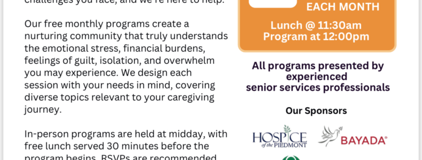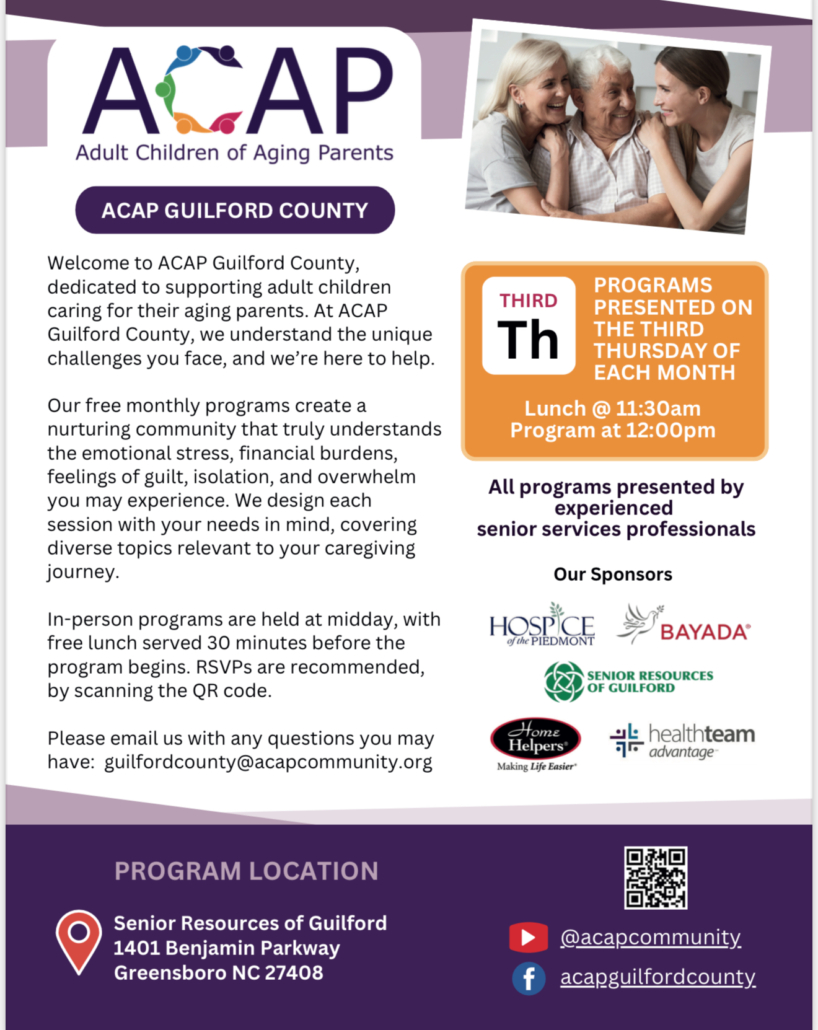 ACAP Guilford County hosts free monthly programs supporting adult children caring for aging parents. Led by experienced senior care professionals, these sessions offer valuable resources and a supportive community.