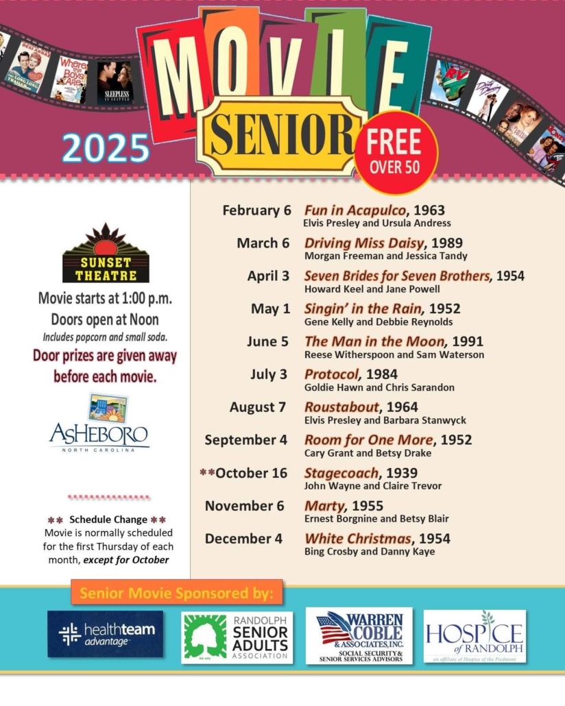 Join us for a fun and relaxing afternoon at the historic Sunset Theatre! Seniors aged 50 and over are invited to enjoy a free movie screening complete with complimentary popcorn and a small soda.