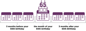 When you’re first eligible for Medicare (for example, when you turn 65), you have a 7-month window to sign up for Part A and/or Part B or a Medicare Advantage plan. That time period is 3 months before your birthday month, your birthday month, and 3 months after your birthday month. So, if you turn 65 in March, for example, you can enroll December through June.