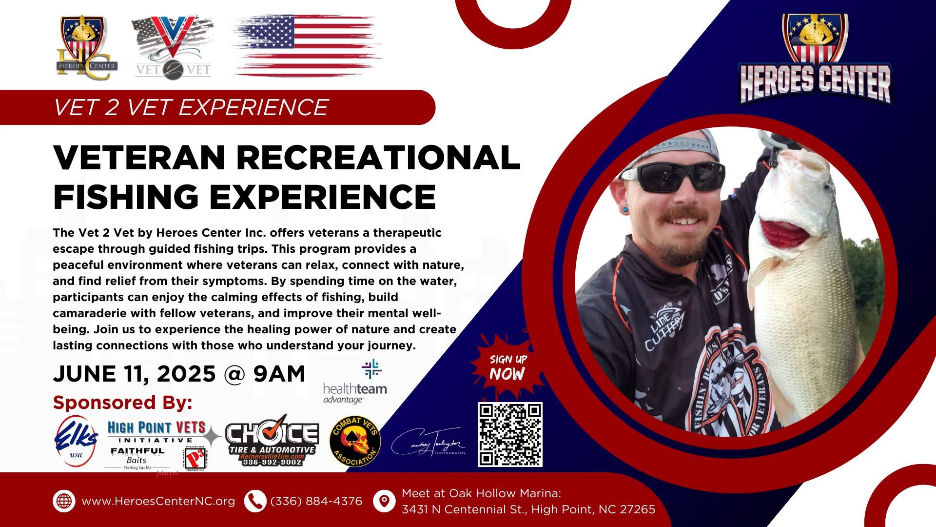 Veteran Recreational Fishing Experience June 11, 2025 @ 9:00 am - 11:00 am Oak Hollow Marina 3431 N Centennial St, High Point, NC, United States The Vet 2 Vet by Heroes Center Inc. offers veterans a therapeutic escape through guided fishing trips.